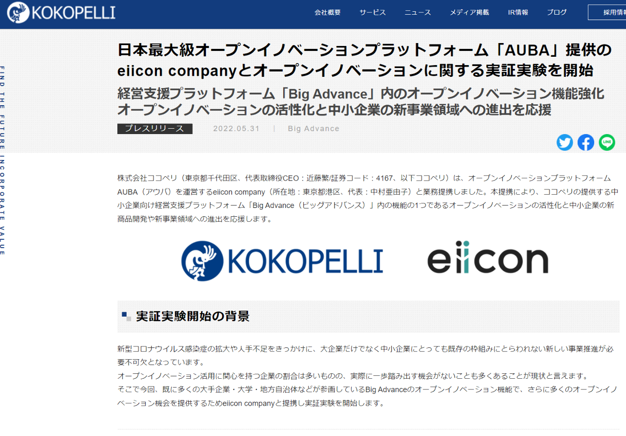 No.12942 2022.05.31 日… - 4167 - (株)ココペリ 2022/04/23〜 - 株式掲示板2022.05.31日本最大級オープンイノベーションプラットフォーム「AUBA」提供のeiicon companyとオープンイノベーションに関する実証実験を開始finance.yahoo.co.jp