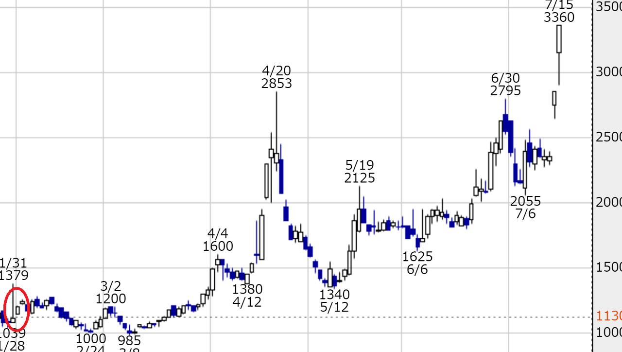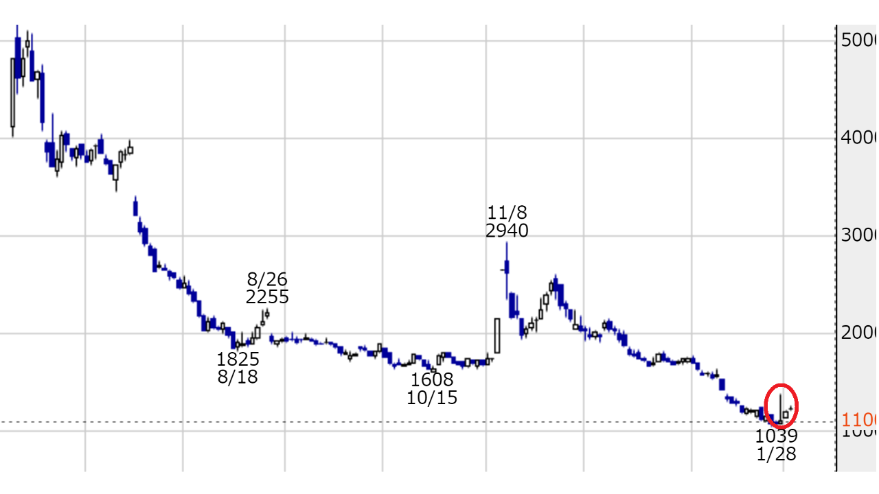 まず1/31始値1079から高値1379のストップ高を経て終値1112と284,800株の商いとなった一日でした。