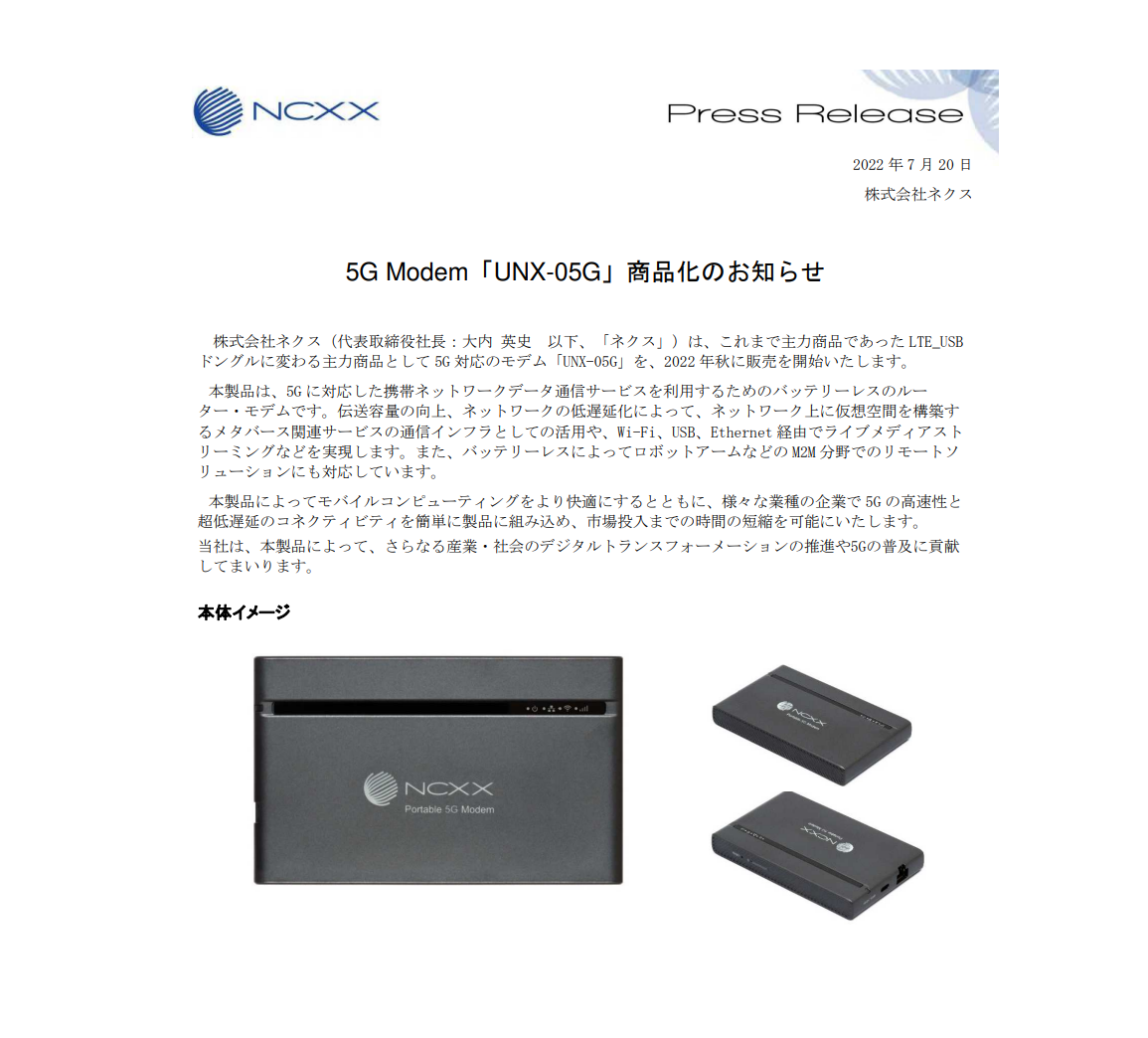 No.53919 2022 年 7 月 20 日… - 6634 - (株)ネクスグループ 2021/12/30〜 - 株式掲示板2022 年 7 月 20 日5G Modem「UNX-05G」商品化のお知らせ株式会社ネクスは、これまで主力商品であった LTE_USBドングルに変わる主力商品として 5G 対応のモデム「UNX-05G」を、2022 年秋に販売を開始いたします。出所:上場企業公式ホームページより引用finance.yahoo.co.jp