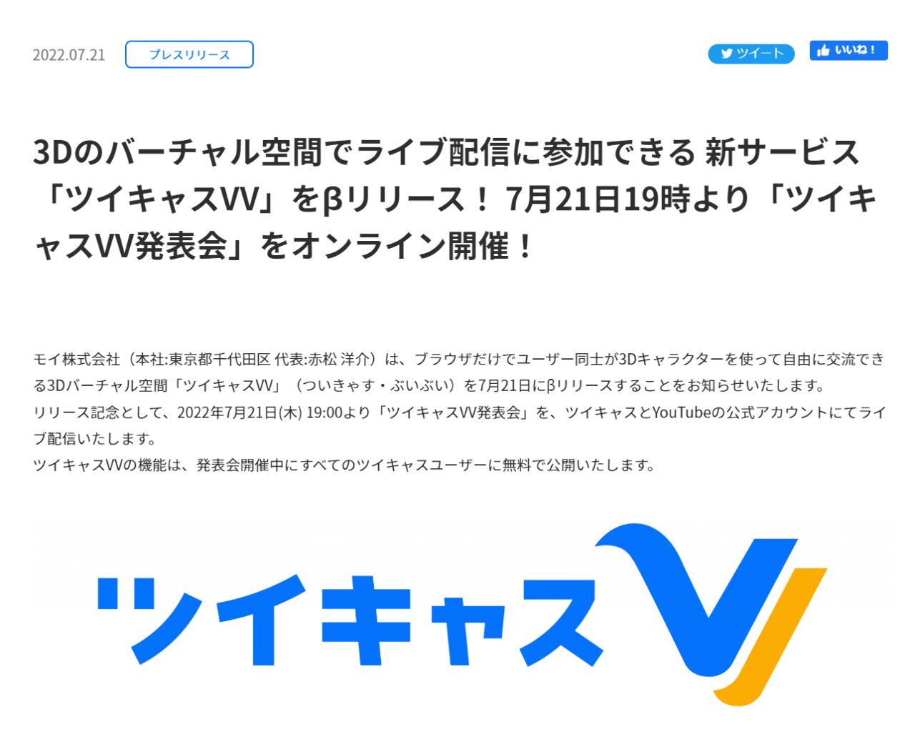 No.31685 2022.07.21 3… - 5031 - モイ(株) 2022/07/15〜 - 株式掲示板2022.07.213Dのバーチャル空間でライブ配信に参加できる 新サービス「ツイキャスVV」をβリリース!モイ株式会社(本社:東京都千代田区 代表:赤松 洋介)は、ブラウザだけでユーザー同士が3Dキャラクターを使って自由に交流できる3Dバーチャル空間「ツイキャスVV」(ついきゃす・ぶいぶい)を7月21日にβリリースすることをお知らせいたします。出所:上場企…finance.yahoo.co.jp