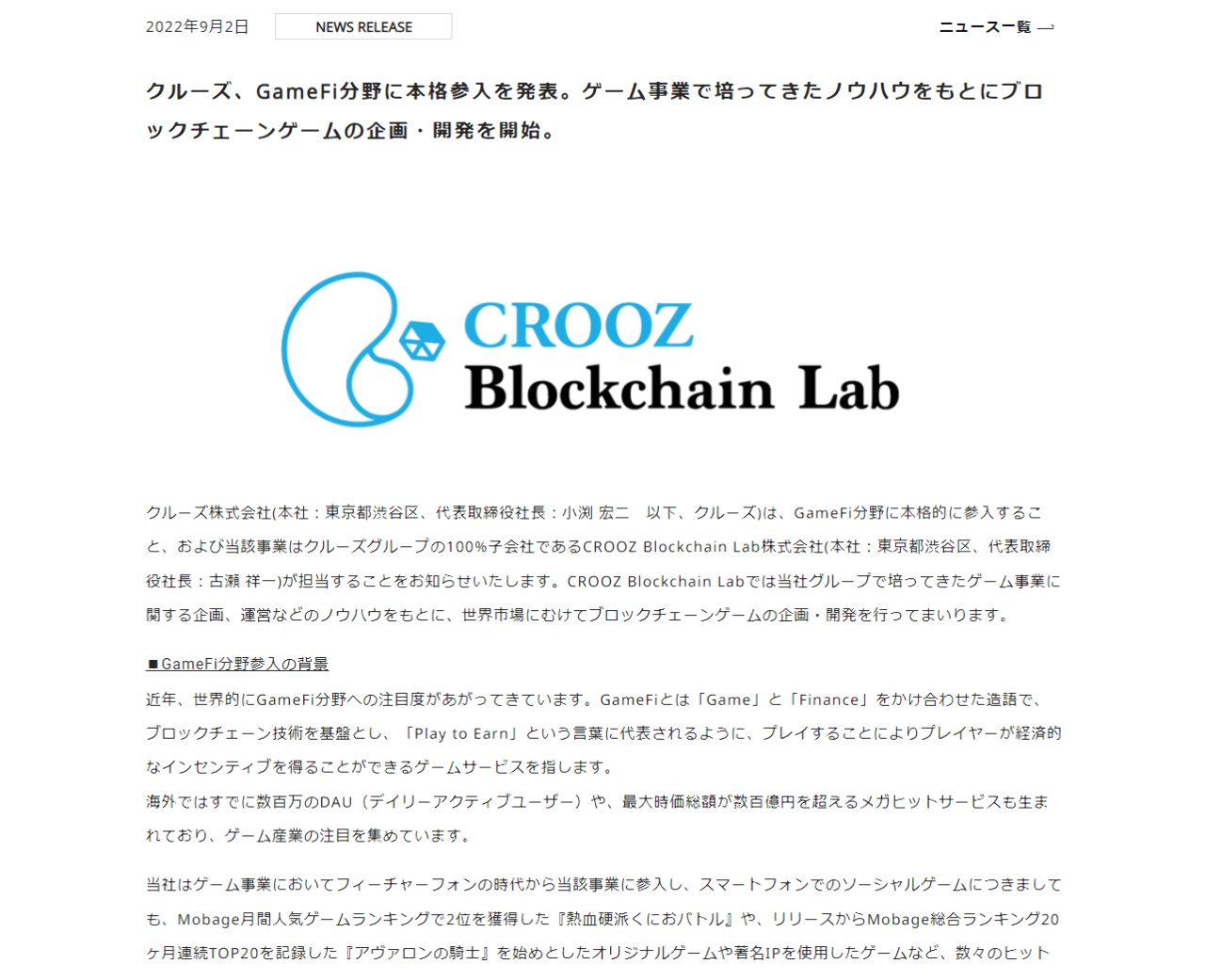No.300098 2022年9月2日 クル… - 2138 - クルーズ(株) 2021/12/15〜2022/09/02 - 株式掲示板2022年9月2日クルーズ、GameFi分野に本格参入を発表。ゲーム事業で培ってきたノウハウをもとにブロックチェーンゲームの企画・開発を開始。出所:上場企業公式ホームページより引用finance.yahoo.co.jp