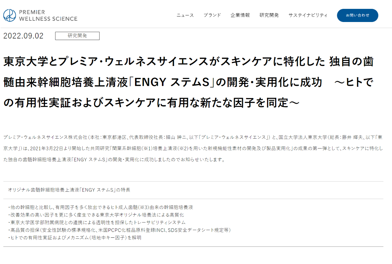 No.72909 9/2 東京大学とプレミ… - 4934 - プレミアアンチエイジング(株) 2022/08/26〜 - 株式掲示板9/2東京大学とプレミア・ウェルネスサイエンスがスキンケアに特化した 独自の歯髄由来幹細胞培養上清液「ENGY ステムS」の開発・実用化に成功 ~ヒトでの有用性実証およびスキンケアに有用な新たな因子を同定~出所:上場企業公式ホームページより引用finance.yahoo.co.jp