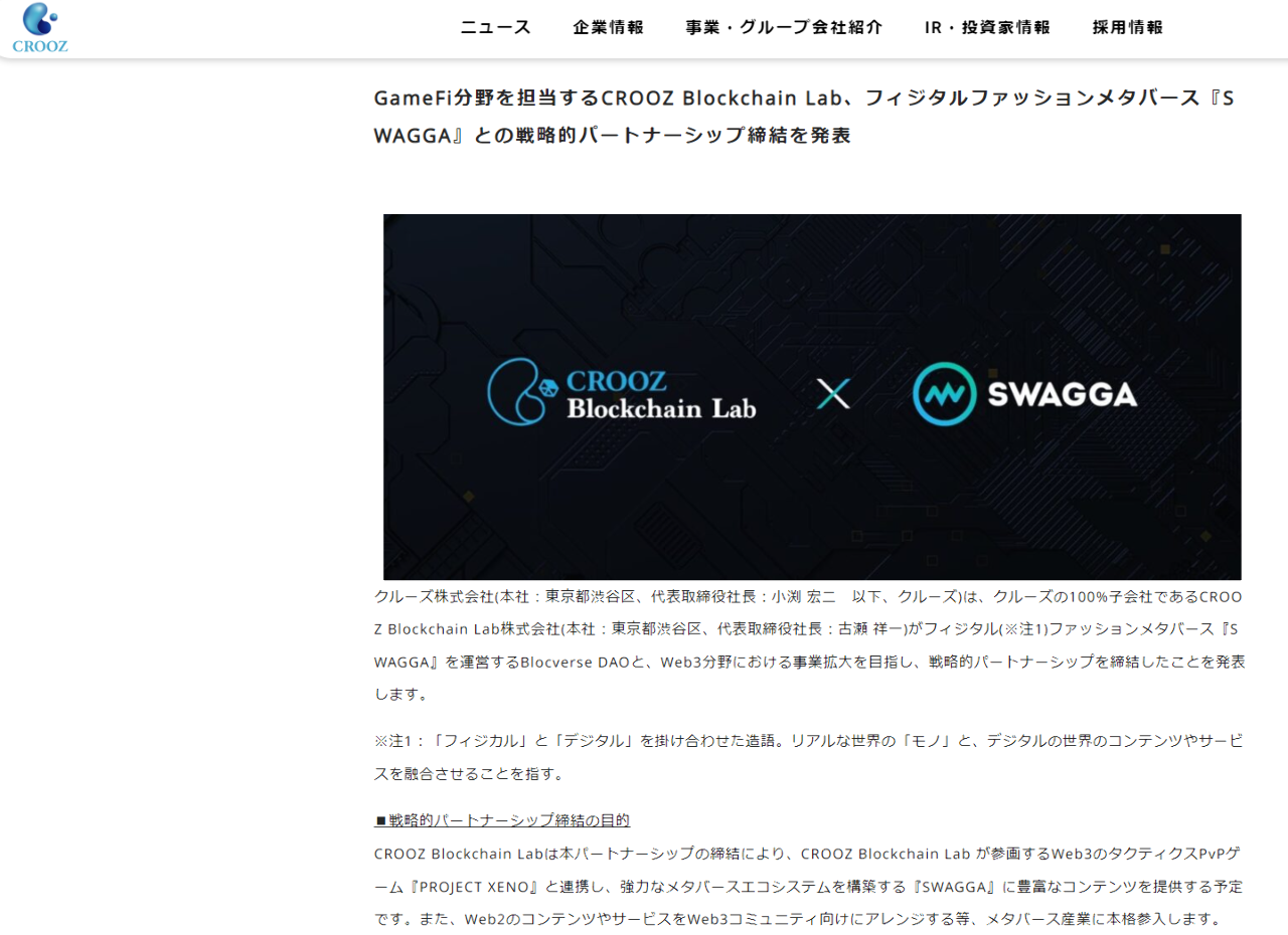 No.301733 9/7 GameFi分野… - 2138 - クルーズ(株) 2022/09/07〜 - 株式掲示板9/7GameFi分野を担当するCROOZ Blockchain Lab、フィジタルファッションメタバース『SWAGGA』との戦略的パートナーシップ締結を発表>強力なメタバースエコシステムを構築する『SWAGGA』に豊富なコンテンツを提供する予定です>また、Web2のコンテンツやサービスをWeb3コミュニティ向けにアレンジする等、メタバース産業に本格参入しま…finance.yahoo.co.jp