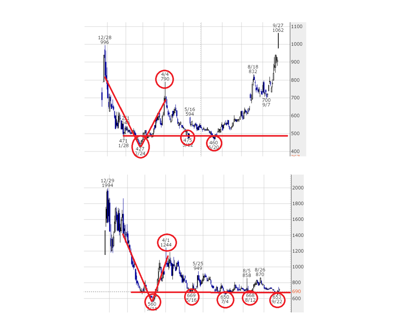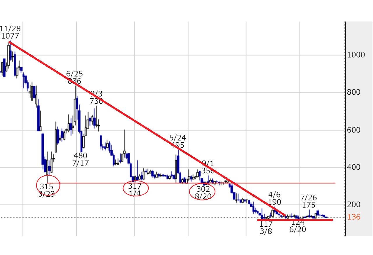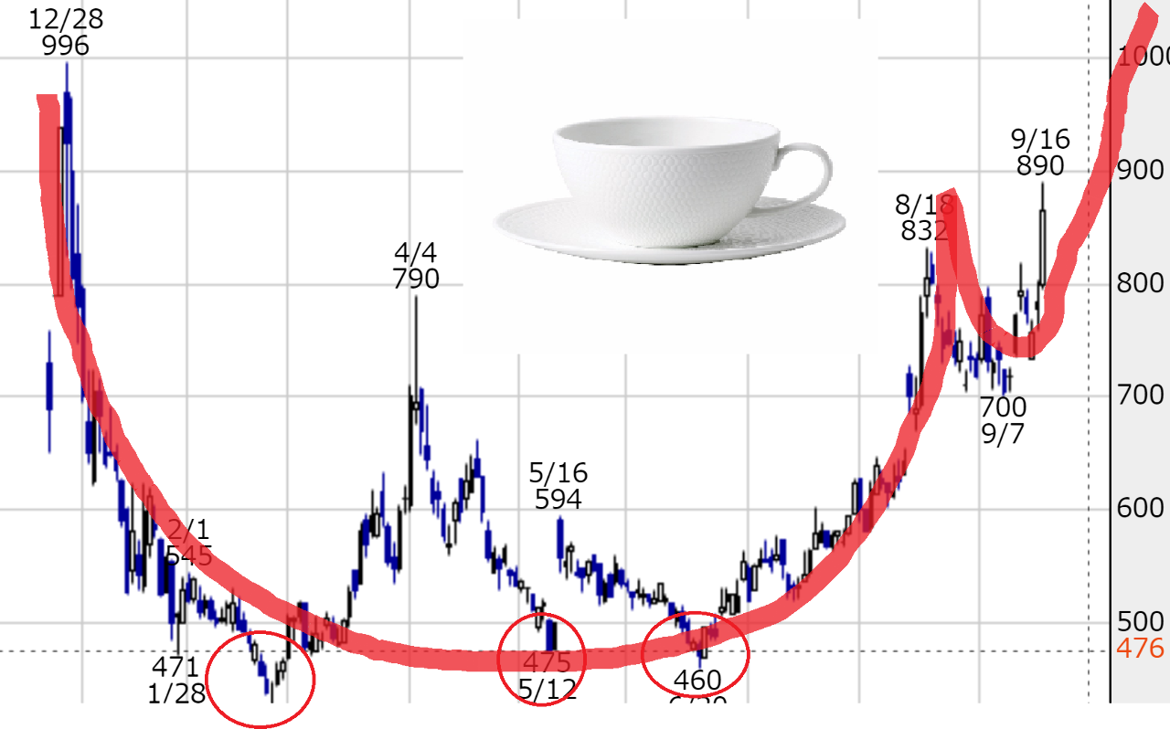 800円台の時にチャートがカップウィズハンドルで注目しているという話をしました。