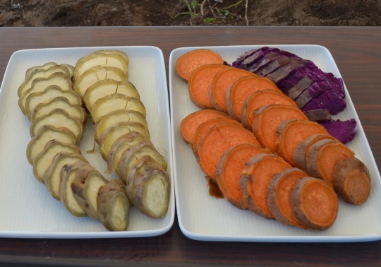 左の白っぽいのが焼酎「霧島」や「黒霧島」の原料、黄金千貫(こがねせんがん)というサツマイモです(たくわんじゃありません!)。右の皿のカラフルな2種も、同社が九州沖縄農業研究センターと共同で改良を重ねてつくりだしたイモ。それぞれ香りや甘味に特徴のある新しい焼酎の原料です。