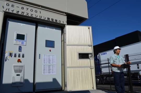 工場の敷地内に新たに設置した発電機。燃料はサツマイモ由来のメタンガスです。