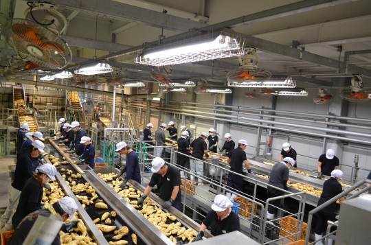 イモの品質を一つずつチェック。ここで切り落とした芋くずも、リサイクルプラントで無駄なく活用されます。