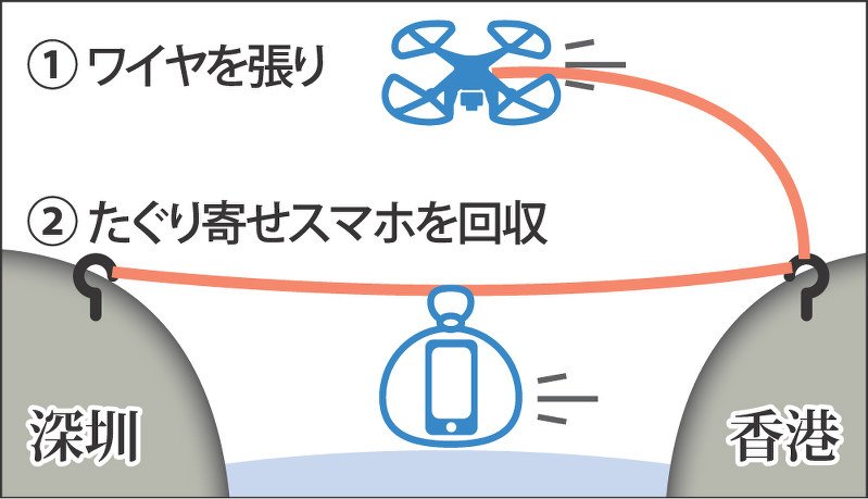 中国メディアによると、容疑者らは2017年後半、深夜から早朝5時ごろにかけ、深セン市羅湖区の高層マンションの部屋からドローンを飛ばして、数十メートル離れた香港の小屋との間を2本のワイヤでつないだ。米アップルのスマホ「iPhone(アイフォーン)」など約10台を入れた袋を香港側でワイヤにくくりつけ、深セン側に設置した巻き取り機でワイヤごとたぐり寄せる方法で、スマホを回収していたなどの疑い。スマホは数十秒で深セン側に届き、一晩で最大1万5000台が運べたという。