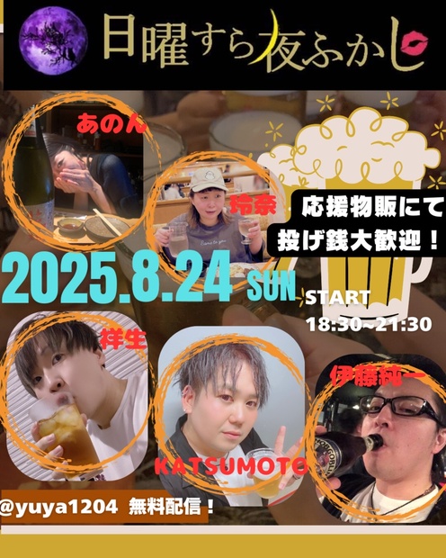 トークライブに出ます!8月24日(日)配信only『日曜すら夜更かし』出演:あのん/玲奈/祥生/KATSUMOTO/伊藤純一18:30~21:30【視聴無料】https://t.co/SlrKvz4qkZYuya新宿WildSide Tokyo & MERRY-GO-ROUNDのブッキング!アニソンウンドウ主催!随時出演や企画お待ちしてます👍配信も対応📹おもろい事やりましょ!『Ama..t.co【応援物販】https://booth.pm/ja/items/7242787【8/24】応援物販『日曜すら夜更かし』ブロマイド - Yuya's オンラインショップ - BOOTH昨年の開催から約1年、今回は男性ゲストを迎えたトークイベント 『日曜すら夜更かし』 応援物販ページです。 全て出演者とライブハウス支援になります。 遠隔で応援できますので、投げ銭代わりとしてもぜひご利用ください! ----- ①ブロマイド この日限定のブロマイド(現物)をお届けします。 ②DL画像 出演者の画像(アー写/ブロマイド/イラストなど)がダウンロー…booth.pm※DL画像はドリンク差し入れです🍺先週に引き続き、またまたイベント出演です!10年近くラジオやってて、トークイベントは初めてかも?公開録音はしたけどね。どうなるかなあ…トークは化学反応するとかあるからな。楽しみだね!