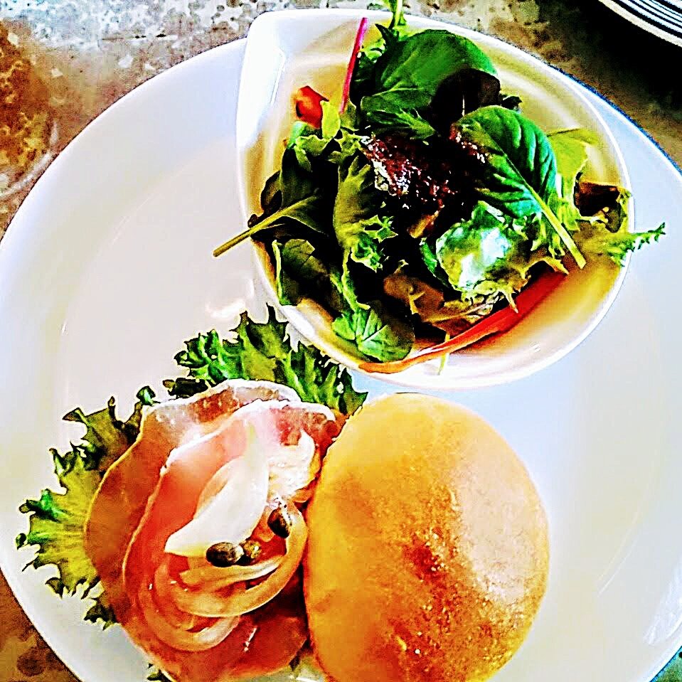 生ハムとクリームチーズのサンドにはミニサラダが付いてきました
