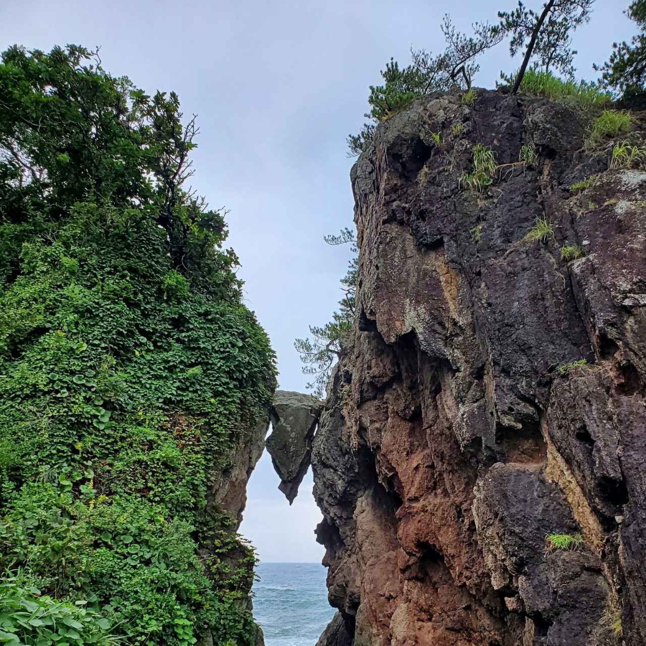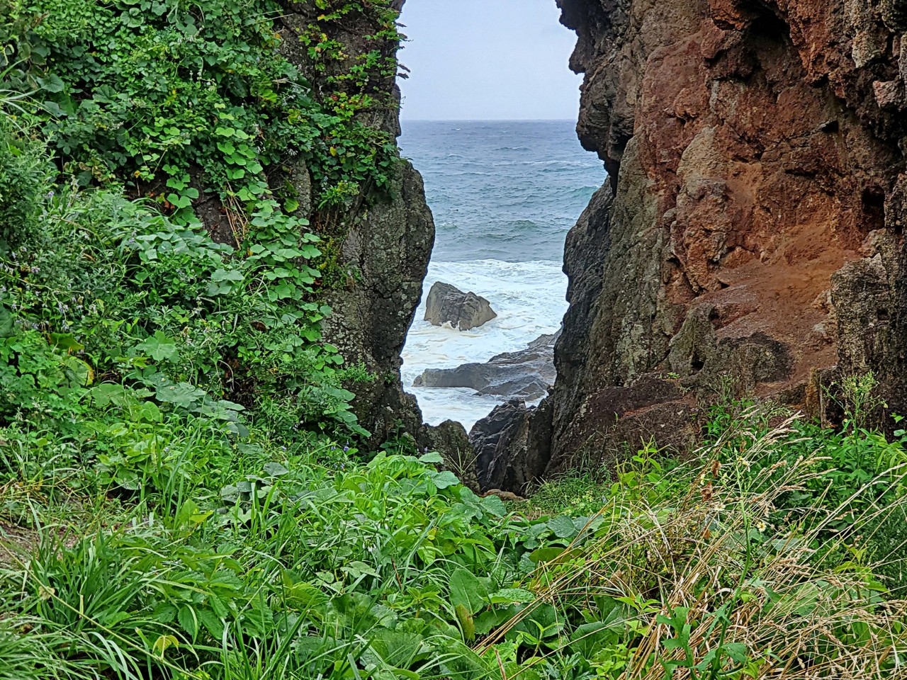 新潟県佐渡市「弁慶のはさみ岩」2019年8月16日 台風接近中の雨の中、荒れる海の側に車を停めて傘もささずに写真を撮っているアイツラいったいなんなんだぜ? そう思われていたのでは?時間も余裕であるので弁慶のはさみ岩も見て来ましたしかし。場所はここで間違いないのにそれらしき景観が見えない…雨にお構いなく歩き回って見つけましたこの岩のちょうど横側に岩と岩の間に!拡大!!その真下!!昔、佐渡弁慶という山伏が鬼に力比べを挑まれその際に佐渡弁慶が投げ飛ばした石がこの挟まっている岩なのでしょうか?佐渡にある奇観のひとつでした🏞️弁慶のはさみ岩新潟県佐渡市相川 国道45号線沿い