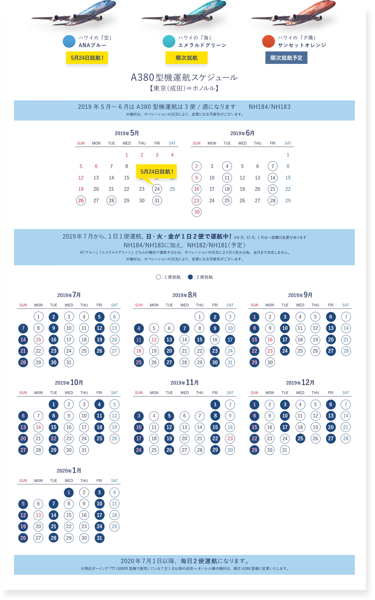 今後、3機のフライングホヌが日本とハワイ(ホノルル)を結ぶ予定。。