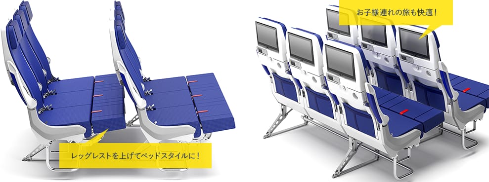 日本の航空会社で初※1となるカウチシート「ANA COUCHii」を導入します。ご利用人数に応じた追加料金で、3席もしくは4席分のレッグレストをあげて、ベッドのように利用することが可能です。カウチシート専用の寝具もご用意します。