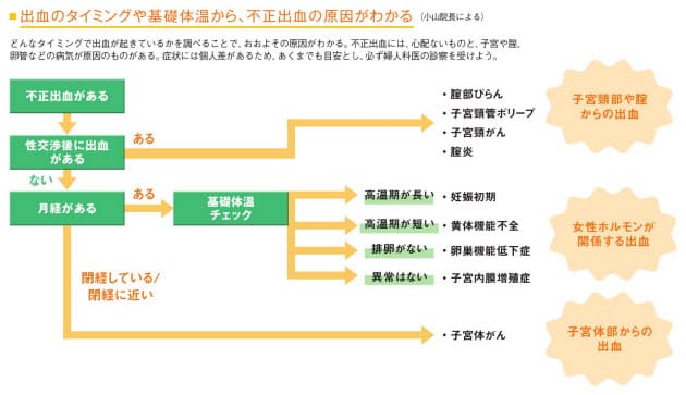 この場合の出血は、年齢なりの変化なので、一般的にはあまり心配はない。ただ「何カ月も続けば、貧血を起こすことも」(小山院長)。月経の変化をよく見ておき、不正出血があれば一度診察を受けておこう。図のセルフチェックも目安になる。