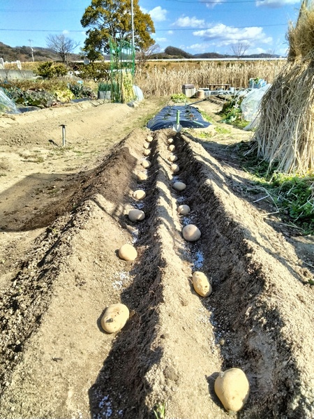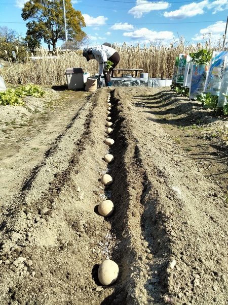 この日は、ちょっと寒かったけれど農園の畑に種ジャガイモを植付けた。