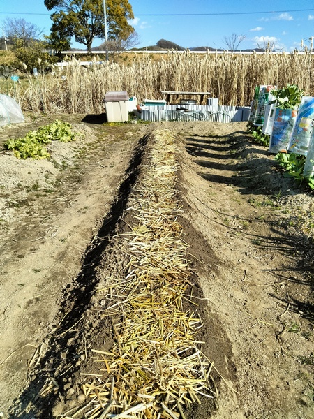 遅霜対策として切った稲わらを撒いておく