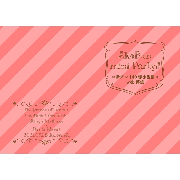 【赤ブン】AkaBun mini Party!! - アメソラ。 - BOOTHA5 無線綴じ 表紙クリアPP / 26ページ (本文22ページ) この商品はpixivFACTORYの同人誌印刷サービス( https://factory.pixiv.net/books )で印刷・製本されます。 『AkaBun mini Party!!-140字小説集 web再録-』 【切原赤也×丸井ブン太】 twitterに掲載している140字小説80…32x3b.booth.pm