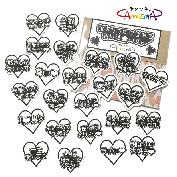 推し活☆まとめ自作の推し活向けアイテムをまとめました•ᴗ•ꕤ*【LINEスタンプ】⬇️推し活☆ファンサうちわ。推し活☆ファンサうちわ。 - LINE スタンプ | LINE STORE推し活に使えるファンサうちわのLINEスタンプです☆store.line.me⬇️推しがいる見切れうさぎ。推しがいる見切れうさぎ。 - LINE スタンプ | LINE STORE推しがいる見切れうさぎ。の推し活LINEスタンプです☆store.line.me⬇️推し事☆スタンプ推し事☆スタンプ - LINE スタンプ | LINE STORE推し事の時に使えるLINEスタンプです。画像加工にも☆store.line.me⬇️推しに届け!推しに届け! - LINE スタンプ | LINE STORE推しへの愛の言葉を集めました!推し活に使えるスタンプです。store.line.me【LINE絵文字】⬇️推しが好きすぎてしんどい。推しが好きすぎてしんどい。 - LINE絵文字 | LINE STORE推しが好きすぎてしんどい動物たちの絵文字です。store.line.me【フレークシール】①推し活☆うちわ⬇️minne推し活☆うちわ【フレークシール】minne.com498円商品を見る⬇️BOOTH【オリジナル】推し活☆うちわフレークシール - アメソラ。 - BOOTH✽+†+✽――✽+†+✽――✽+†+✽―― 閲覧ありがとう御座います✩.*˚ ◆内容 推し活向きのフレークシールです! 可愛い猫型のファンサ用うちわになっています。 お手紙や手帳、日記などに*ˊᵕˋ* [商品詳細] ・合計 32枚入(画像2枚目参照) ・サイズ(画像参照) 約2×2.5cmぐらい ・素材:普通紙 ★注意★ ・家庭用のインクジェットプリンタで…32x3b.booth.pm②推し色に塗れる!推し活★ハート⬇️minne推し色に塗れる!推し活★ハート【フレークシール】minne.com498円商品を見る⬇️BOOTH【オリジナル】推し色に塗れる!推し活★ハートフレークシール - アメソラ。 - BOOTH✽+†+✽――✽+†+✽――✽+†+✽―― 閲覧ありがとう御座います✩.*˚ ◆内容 お好きな色に塗ることが出来る白黒のフレークシールです。 マーカー等で推しや自担の色に塗って推しカラーアピール出来ます☆ 推し活のお供に使って頂けたら嬉しいです! お手紙や手帳、日記などに*ˊᵕˋ* [商品詳細] ・合計 24枚入(画像2枚目参照) ・サイズ(画像参照) 約…32x3b.booth.pmよろしくお願いいたします(⁎ᴗ͈ˬᴗ͈⁎)