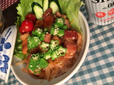 辛く味付けしたのを敷いて、その上に煮豚、オクラを載せました