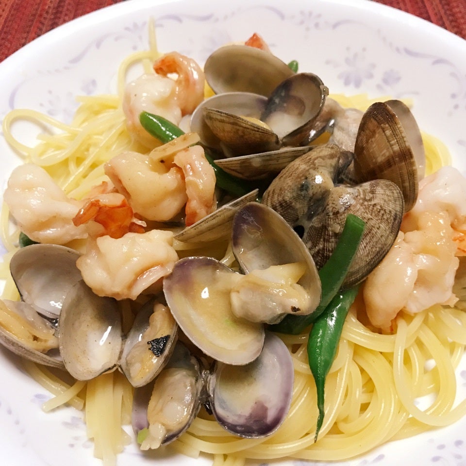 にんにくを炒め、香りが出て来たら海老、あさり、インゲンをサッと炒め、お酒②を全量加える。(中火)