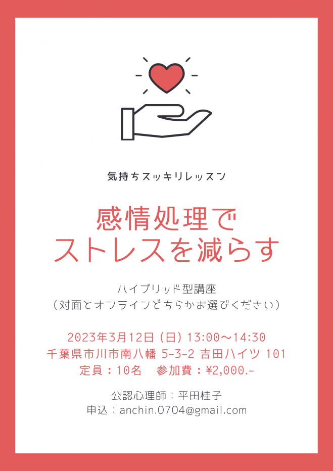 3月12日(日)に市川市で開催のストレスケア気持ちスッキリレッスン、まだお席がございます。