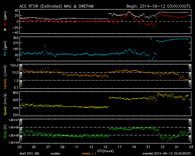 ACEが観測した太陽風の磁場(1番上の枠、白線は全体の強度、赤線は南北成分)および、太陽風の密度(3番目の橙線)、速度(4番目の黄線)