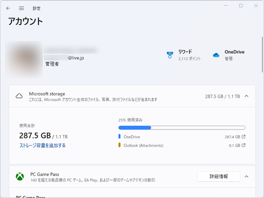 「設定」アプリの[アカウント]ページに「OneDrive」サブスクリプションのストレージ容量