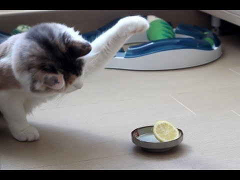 レモンの切れ端と戦う猫