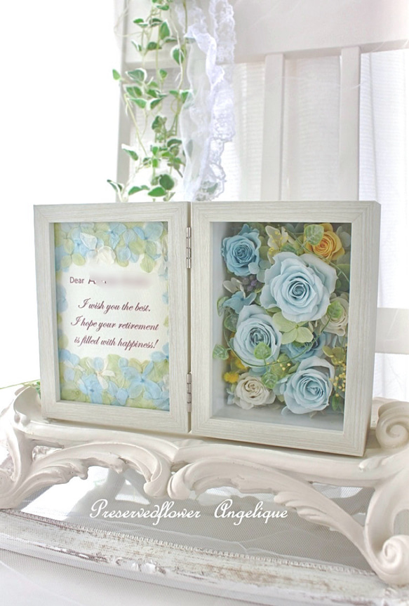 メッセージ部分は数種類のグリーンカラーのプリザーブドアジサイでデザインしています。