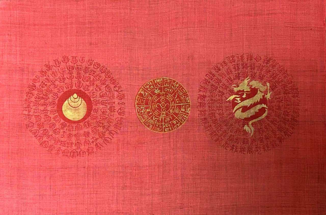 様々な書き方の龍の文字を赤い染料で書き入れます。