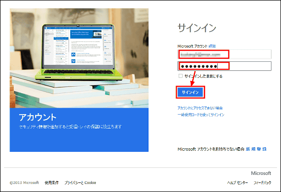 まずはログイン画面でアカウント名とパスワードを入力してMicrosoftアカウントにログイン。