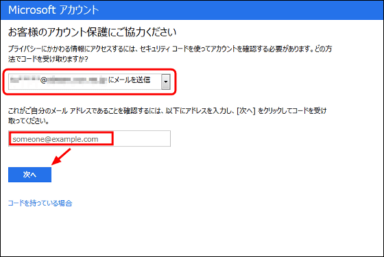 内容を確認するためにはセキュリティコードを入力する必要があります。今回はメールでのコード取得方法を選び、受信用アドレスを入力して「次へ」をクリック。