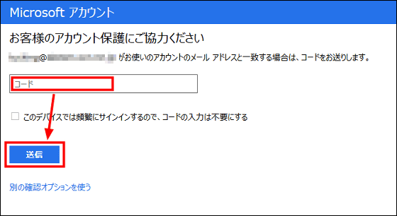 アドレスにセキュリティコードが届いたら、入力して「送信」をクリック。