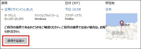 見に覚えのないアクセスであることが明らかな場合は、「自分ではない」をクリックしてMicrosoftに通知し、パスワードを変更します。