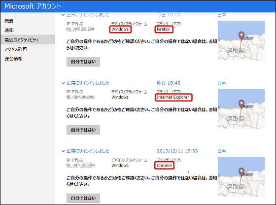 最近行われたログイン履歴画面が表示されました。