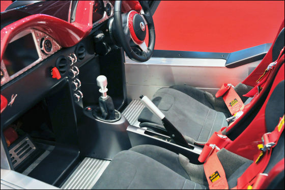こちらもレーシングカーのようなインテリア。シートはアルミ製のシャシーに低く設置され、まるでそのまま床に座るレベルの低さです。