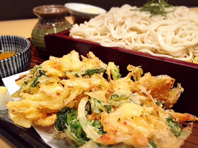 海老3本と茄子の天丼、小鉢と、かけそば。