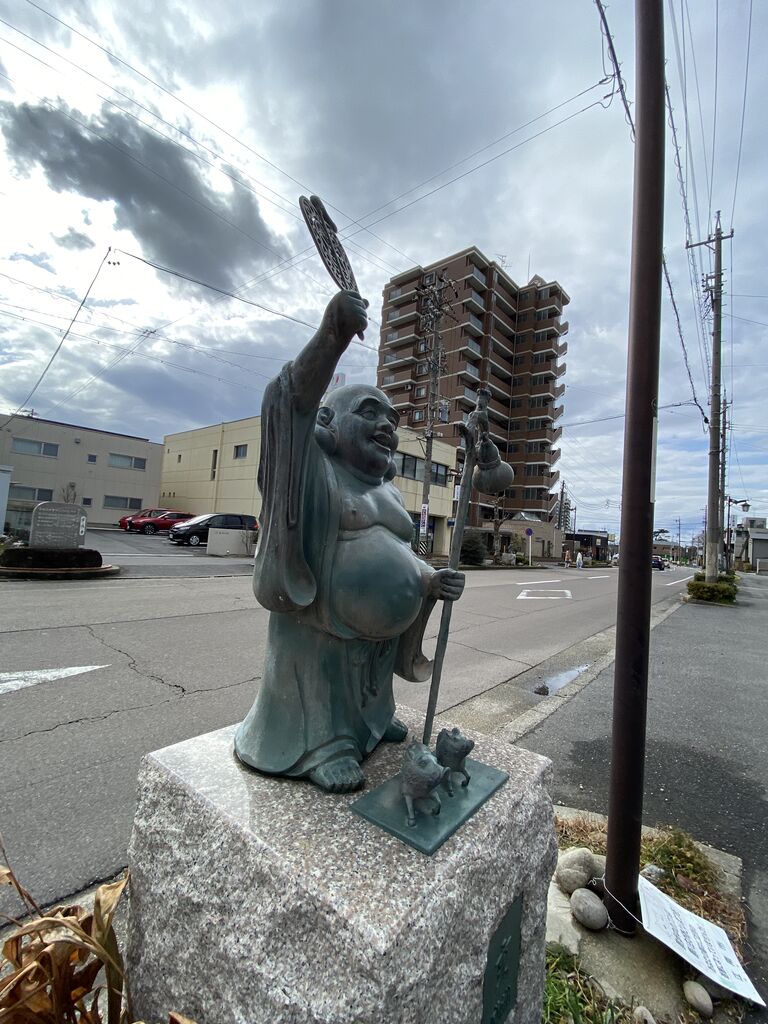 布袋駅前通りは布袋像が道路両脇にたくさんありました