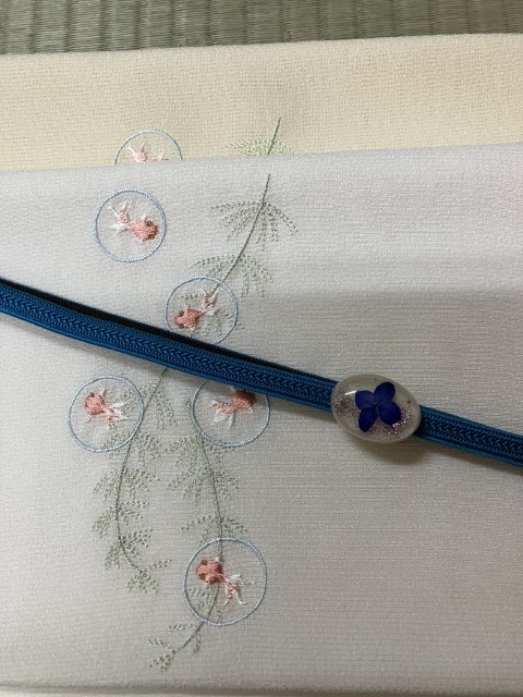帯締めは,まだ冬用を着用していますが見た目の涼しそうな色を使っています。