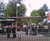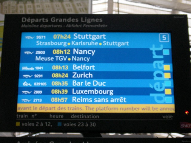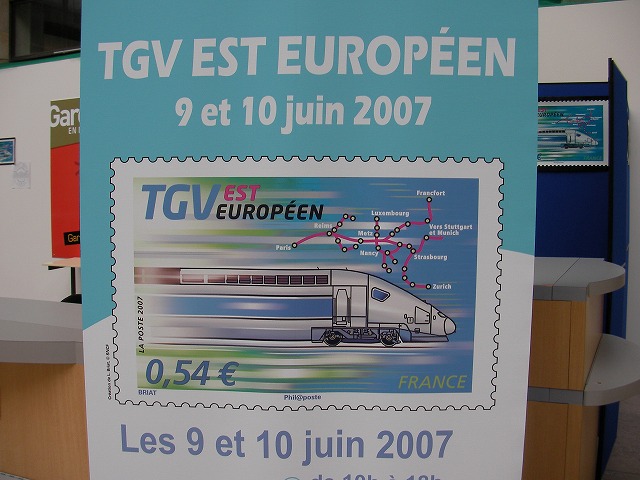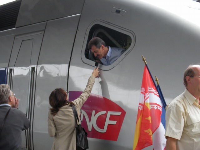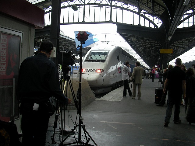 今日10日、ドイツとフランスの高速鉄道が初めて相互乗り入れをする。パリ東駅からは世界最速記録をもつTGVがストラスブールを通りドイツのシュツットガルトへ、そしてドイツフランクフルト駅からはICE(インターシティーエクスプレス)がパリへ。それぞれこれまでより約2時間短縮される。営業最高速度は320km。拡大するヨーロッパ内を結ぶ大動脈(架け橋)として人の動きをよりスムーズにし、EU全体の経済発展に大きく寄与する役割を担う。パリの東駅では7:24発ストラスブール行きが一番列車。出発前運転席側面にフランス国旗と東部アルザス地方の旗を取り付けて装飾。そしてどんなオープニングセレモニーがあるかと思いきや、特になし・・・。残念。日本だったらプレス対応でテープカットだの、くす玉だの当たり前なのに。(ストラスブール駅ではもっと大々的にセレモニーやっているとか。)ただ時刻表を見ると午前中9時台に1本特別セレモニー用列車を走らせるようだ。あえて朝一番の早い時間に何かやるよりも、わりきって営業運転とわけたこの方式のほうがしっかりとパブリシティ取れるかも。絵的にも。