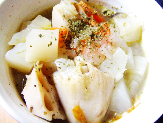 かぶ、れんこん、にんじん、たまねぎ、しめじ、セロリ、ベーコン