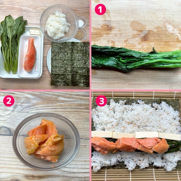 ③ 焼きのりの上に、【B】を混ぜたご飯を広げる。①、②、縦半分に切ったプロセスチーズを1列に並べる。手前から奥に向かって巻き、食べやすい大きさに切り分けたら、完成!