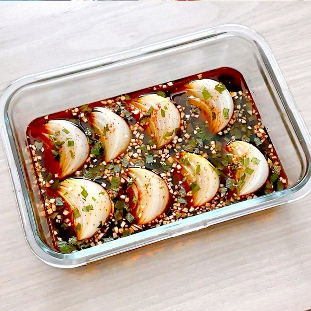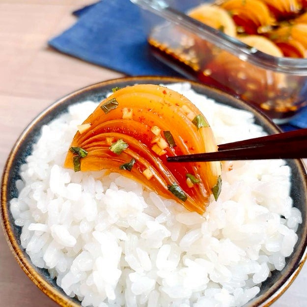 漬けだれごとかけると、即席の玉ねぎ丼に。シンプルな材料なのに、満足度がとにかく高い。冷蔵庫にこれがあるだけで安心感がすごい。「あと一品どうしよう? 」が一瞬で解決します。