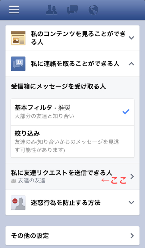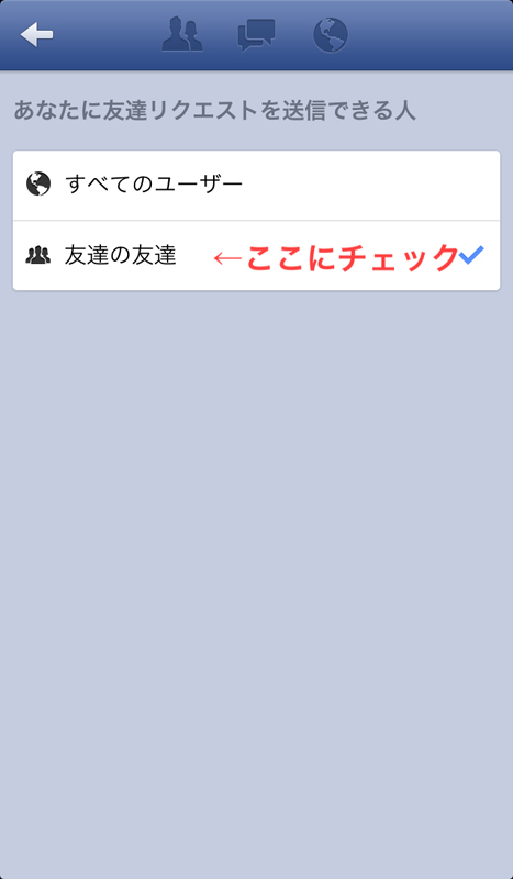 写真④:「友達の友達」を選ぶと、共通の友達がいないとリクエストできないので、スパムがなくなります。
