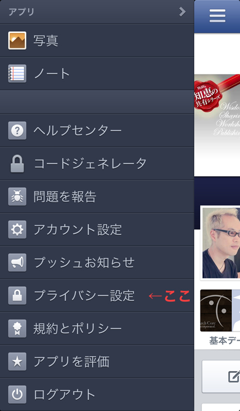 写真①:まず、設定のところから「プライベート設定」を選ぶ。