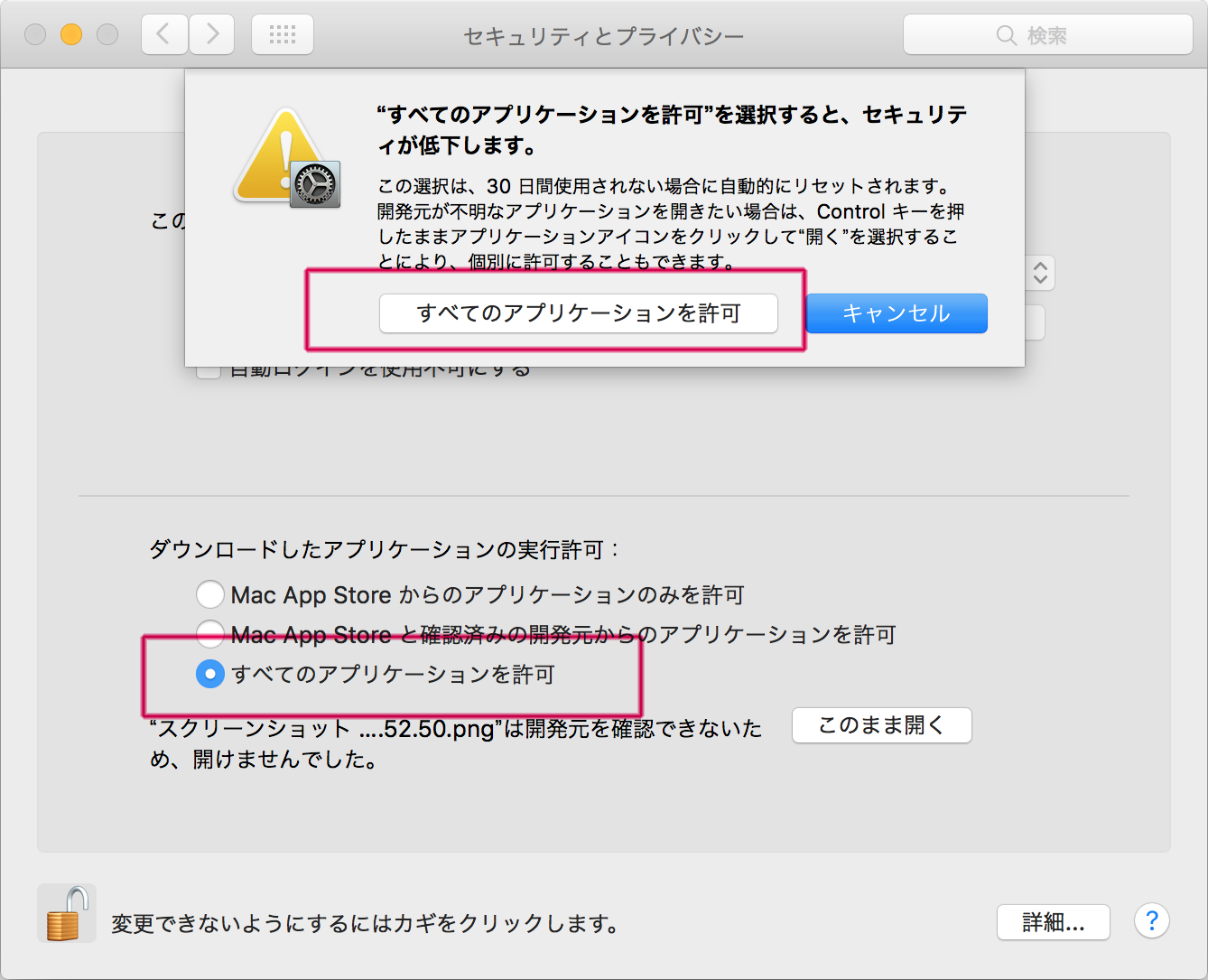 Macで、ファイルを開いたり、インストーラを起動しようとすると、たまにこんな表示が出たりします。