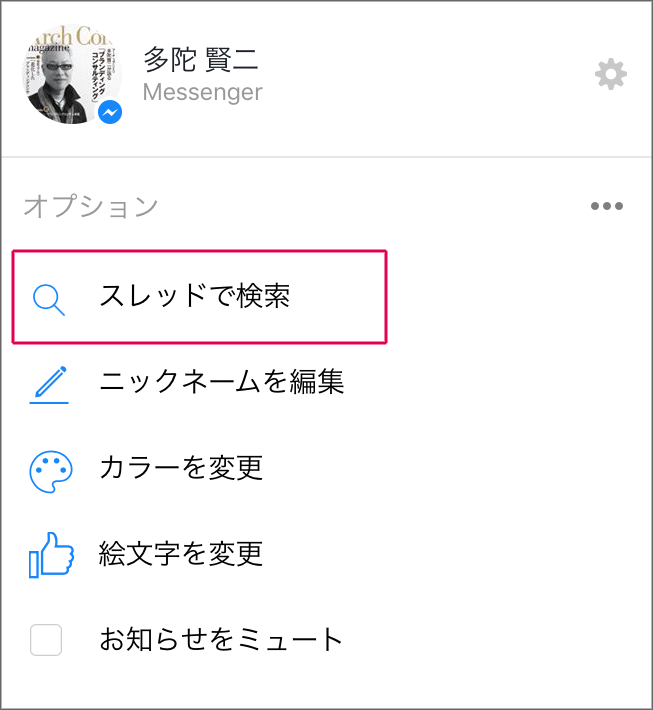 ■「セクションを表示」すると、一番上に「スレッドで検索」が表示されるので、ここで以前の個人のスレッドの中での検索ができる、というわけです。