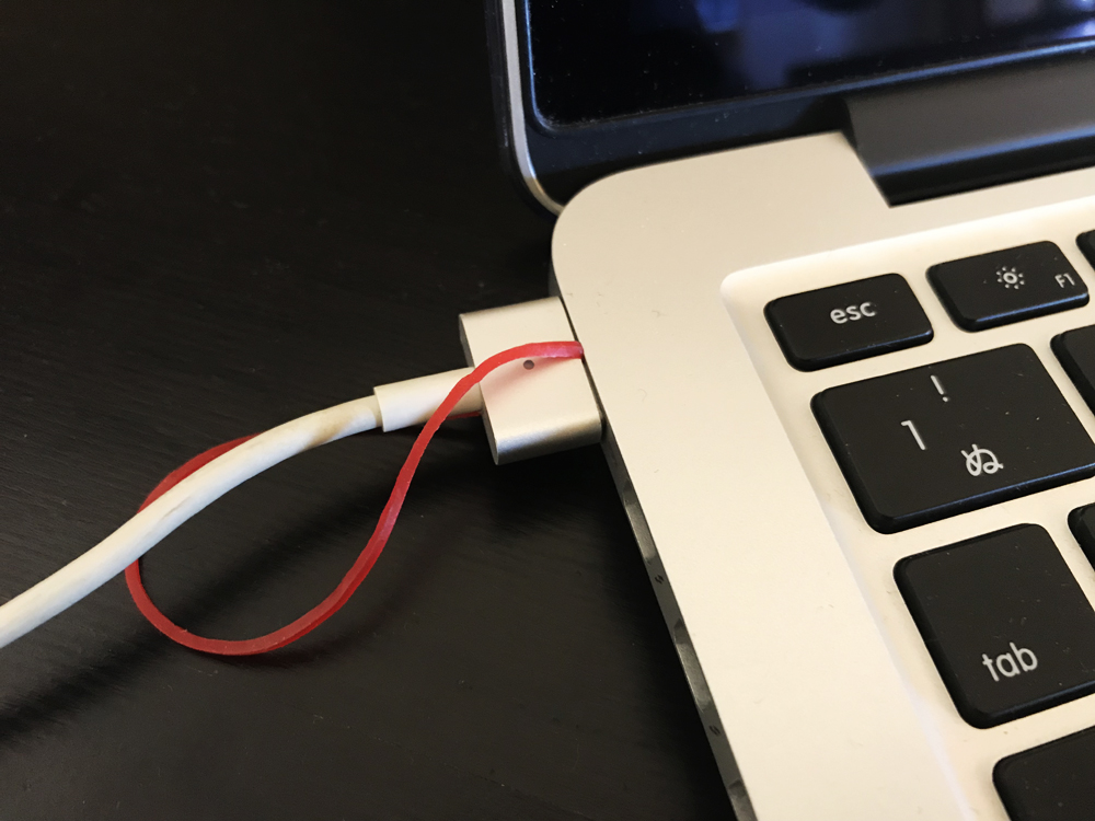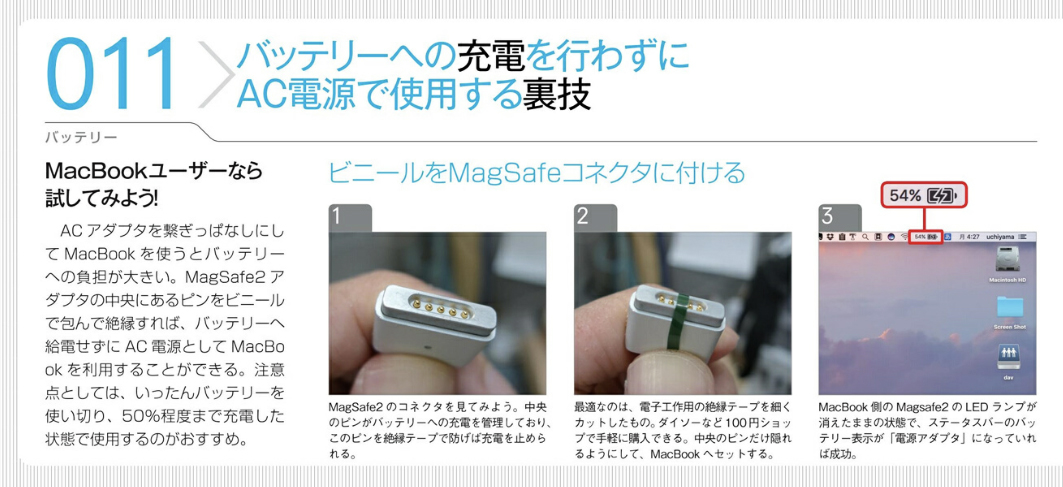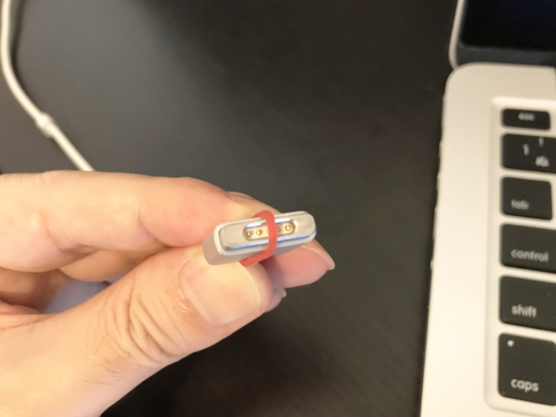 MagSafe2アダプタ(コネクタ)の中央にあるピンをビニールで包んで絶縁すれば、バッテリーへ給電せずにAC電源としてMacBookを利用することができる。