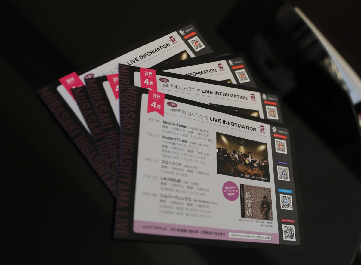 ムラサキさんは、毎月ライブ案内のためのミニフライヤーを作成しています。