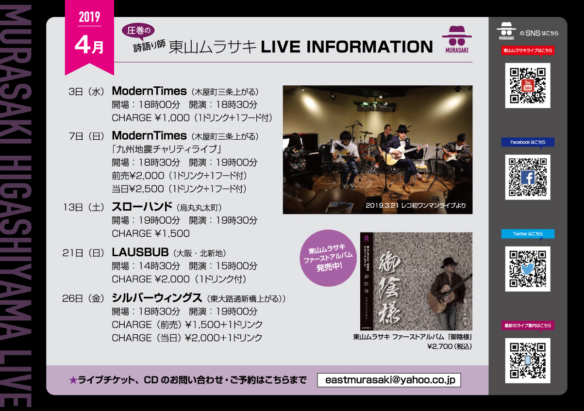シンガーソングライターの東山ムラサキさんのライブミニフライヤーが届きました。